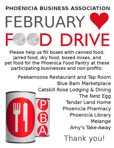 Please help us fill boxes with canned food, jarred food, dry food, boxed mixes, and pet food for the Phoenicia Food Pantry at these participating businesses and non-profits: