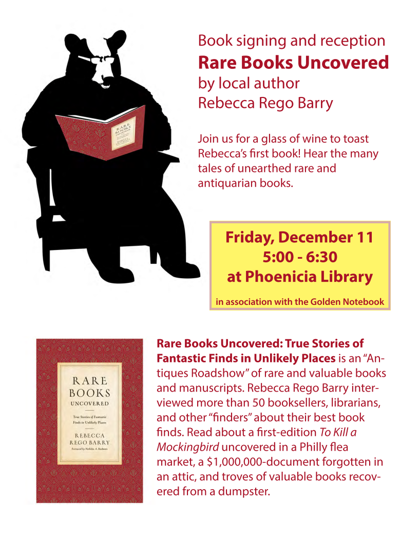 Book Signing and Reception with Rebecca Rego Barry. Join us for a glass of wine to toast local author Rebecca Barry’s first book, Rare Books Uncovered: True Stories of Fantastic Finds in Unlikely Places (2015). Come hear the many tales of unearthed rare and antiquarian books.