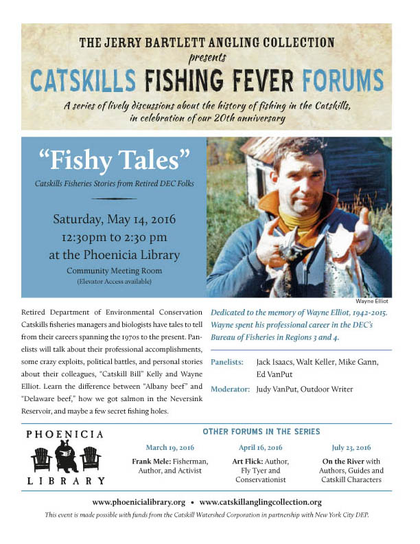 Catskills Fishing Fever Forum: Fishy Tales. Catskills area fisheries managers and biologists have many tales to tell from their rich careers spanning the 70s to the present. Hear them recount crazy exploits, political battles and personal stories, and if you listen closely, they may just divulge a few secret fishing holes. The series is made possible with funds from the Catskill Watershed Corporation in partnership with NYC Dept of Environmental Protection.