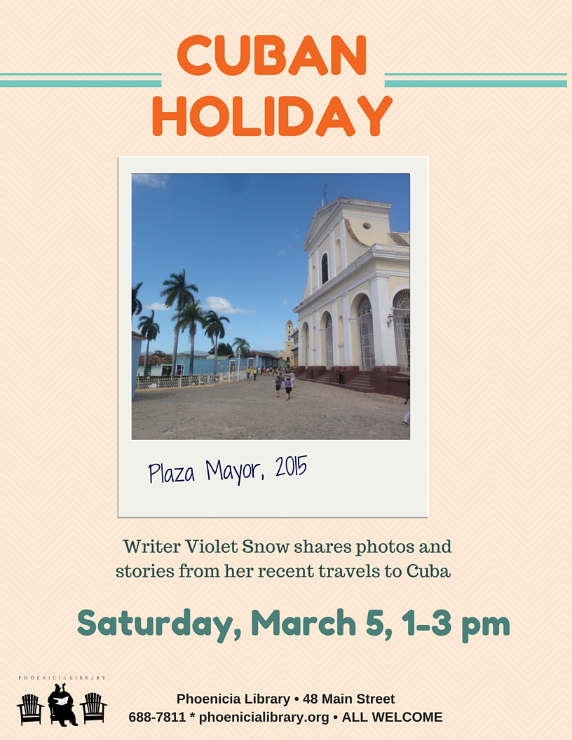 Saturday, 3/5 @ 1-3pm  Cuban Holiday. Writer Violet Snow recently returned from spending the winter holidays in Cuba.  Escape the March cold by spending a couple of hours with Violet as she shares photos and stories from her travels to the renowned Caribbean nation